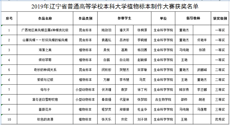 我校在2019年辽宁省大学生动植物标本制作大赛中喜获佳绩