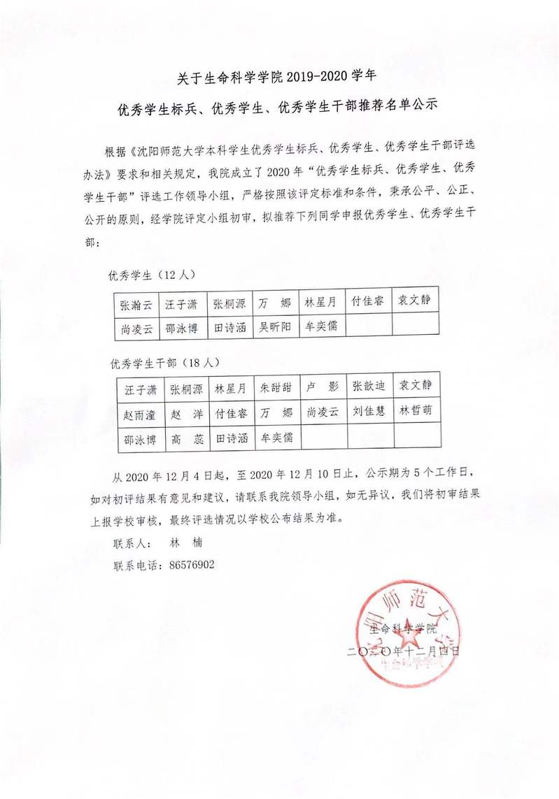 关于生命科学学院2019-2020学年 优秀学生标兵、优秀学生、优秀学生干部推荐名单公示