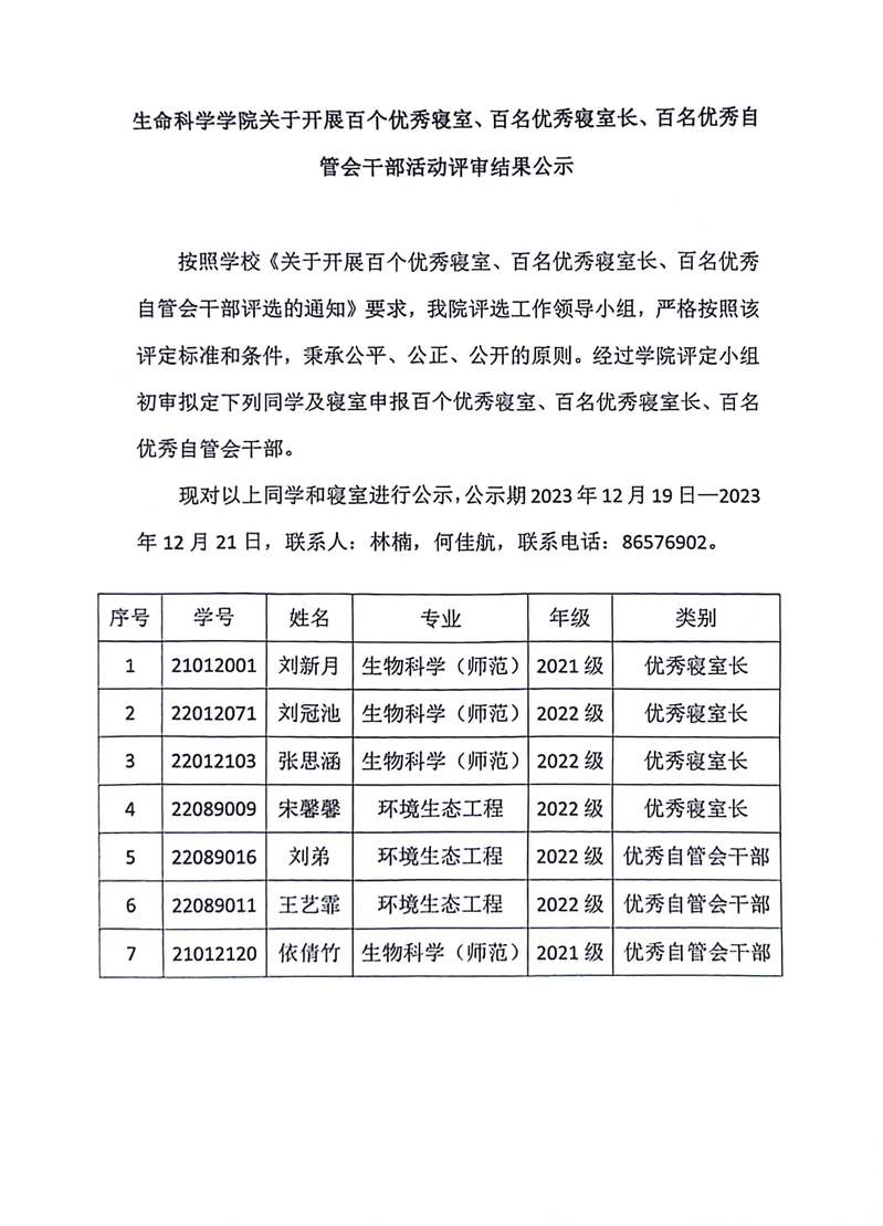 生命科学学院关于开展百个优秀寝室、百名优秀寝室长、百名优秀自管会干部活动评审结果公示