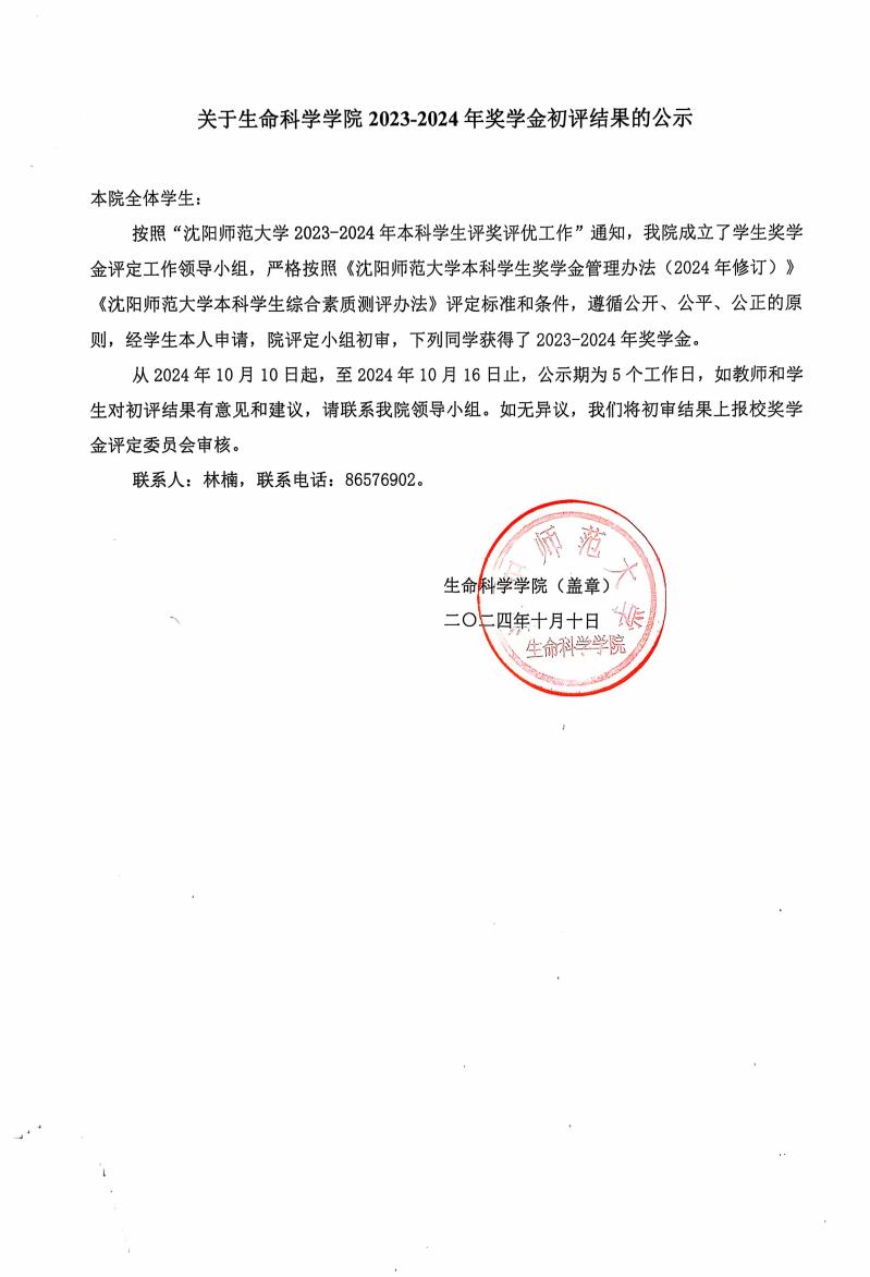 关于生命科学学院2023-2024年奖学金初评结果的公示