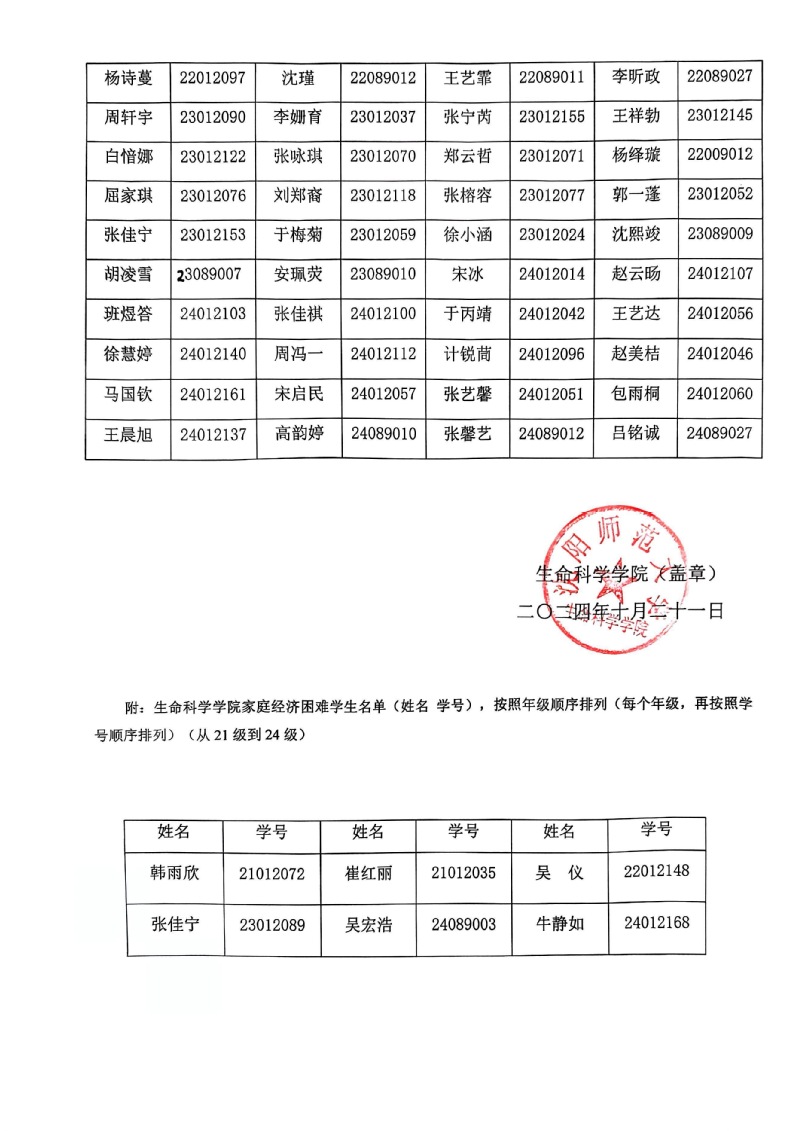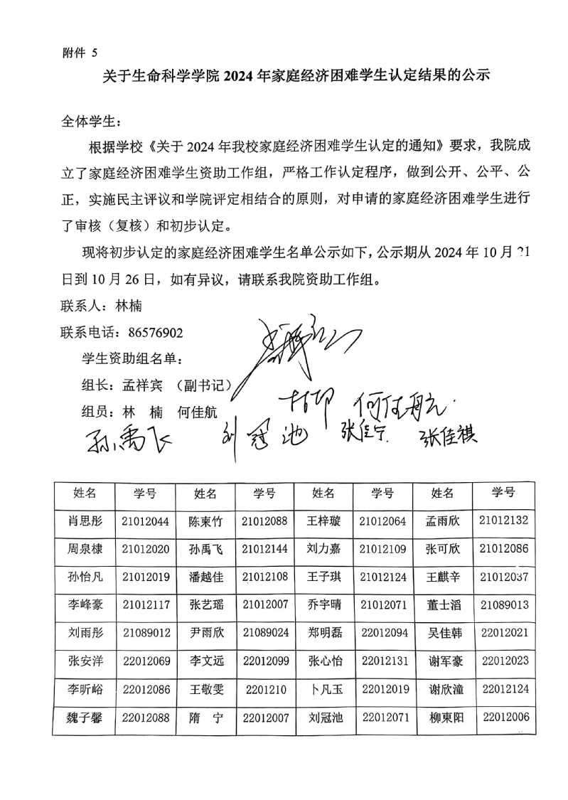 关于生命科学学院2024年家庭经济困难学生认定结果的公示