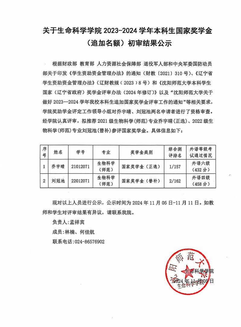 关于生命科学学院2023-2024学年本科生国家奖学金(追加名额)初审结果公示