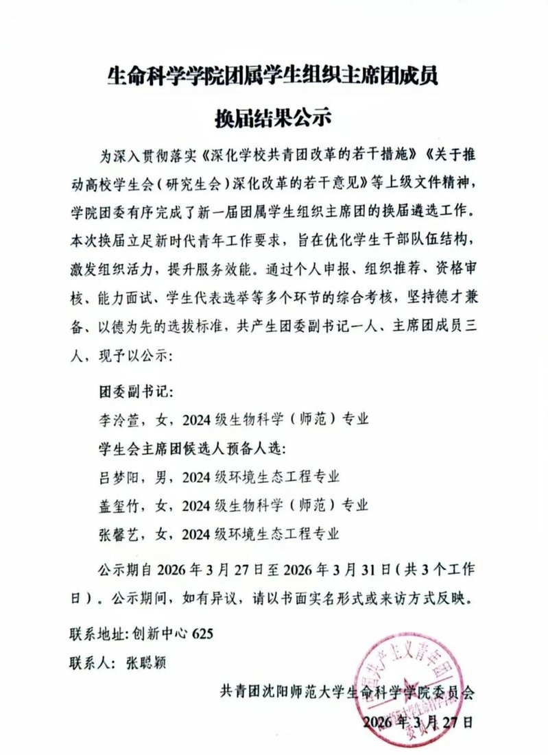 生命科学学院团属学生组织主席团成员换届结果公示